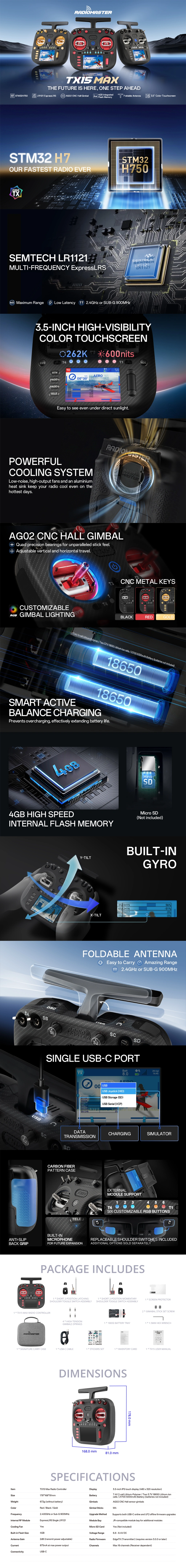 RadioMaster continúa redefiniendo el panorama del control remoto de código abierto. Tras años de colaboración con nuestros socios y usuarios de código abierto, nos enorgullece presentar el TX15 MAX. Impulsado por el chip STM32 H7 de alto rendimiento, es la base de nuestra radio más rápida hasta la fecha, lo que permite un control EdgeTX ultrafluido, cambio de modelo instantáneo y una ejecución de scripts ultrarrápida. Con 4 GB de almacenamiento flash y expansión mediante tarjeta MicroSD, dispondrá de espacio prácticamente ilimitado para modelos, scripts, sonidos y temas.