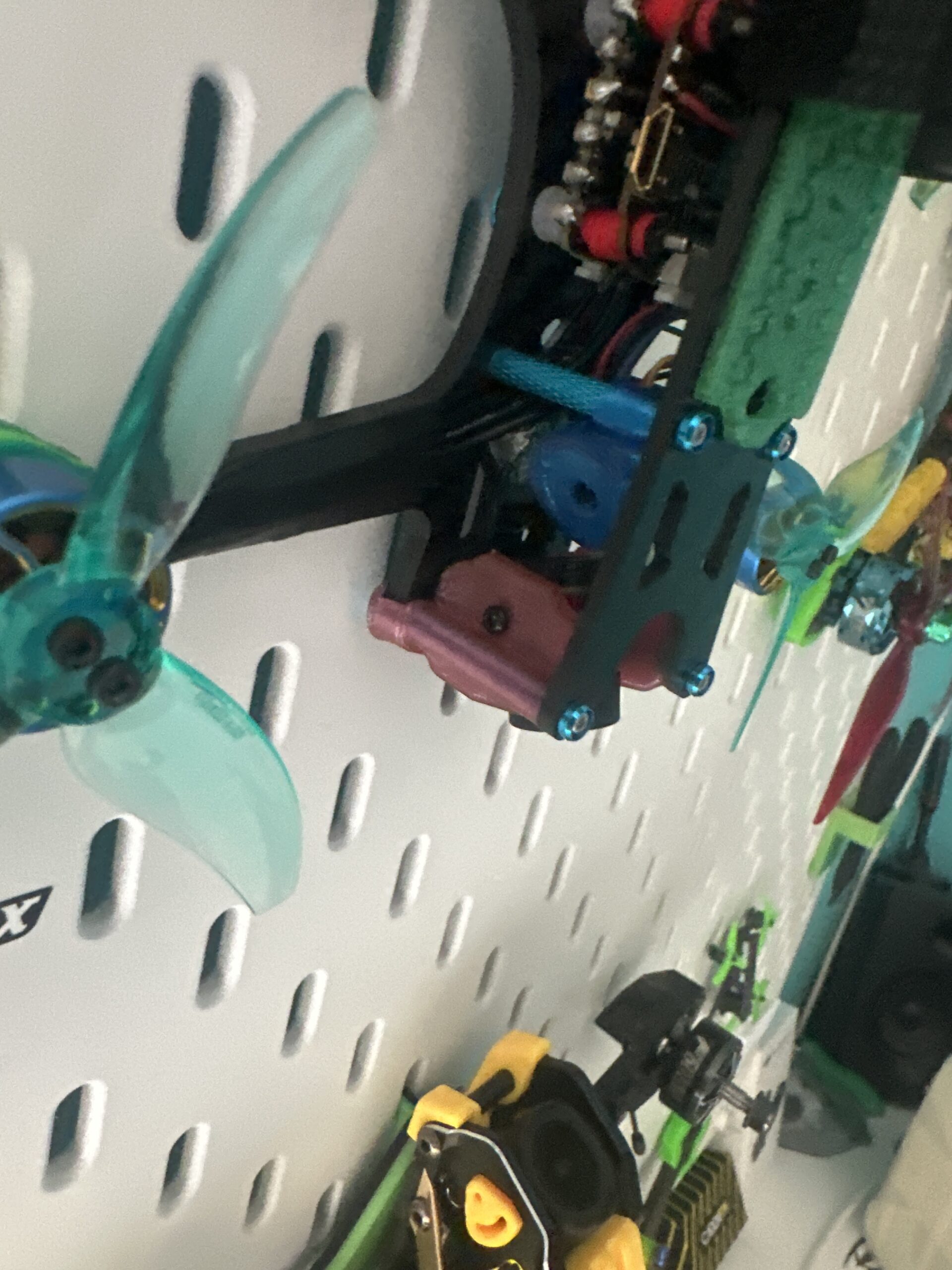 El tamaño es muy perfecto para drones pequeños, yo lo usé para un 3” que tenía muy poco espacio, y imprimiendo cosas en tpu lo puse sujeto a una columna separador. 10/10 en la foto se ve, es lo azul 👌🏻